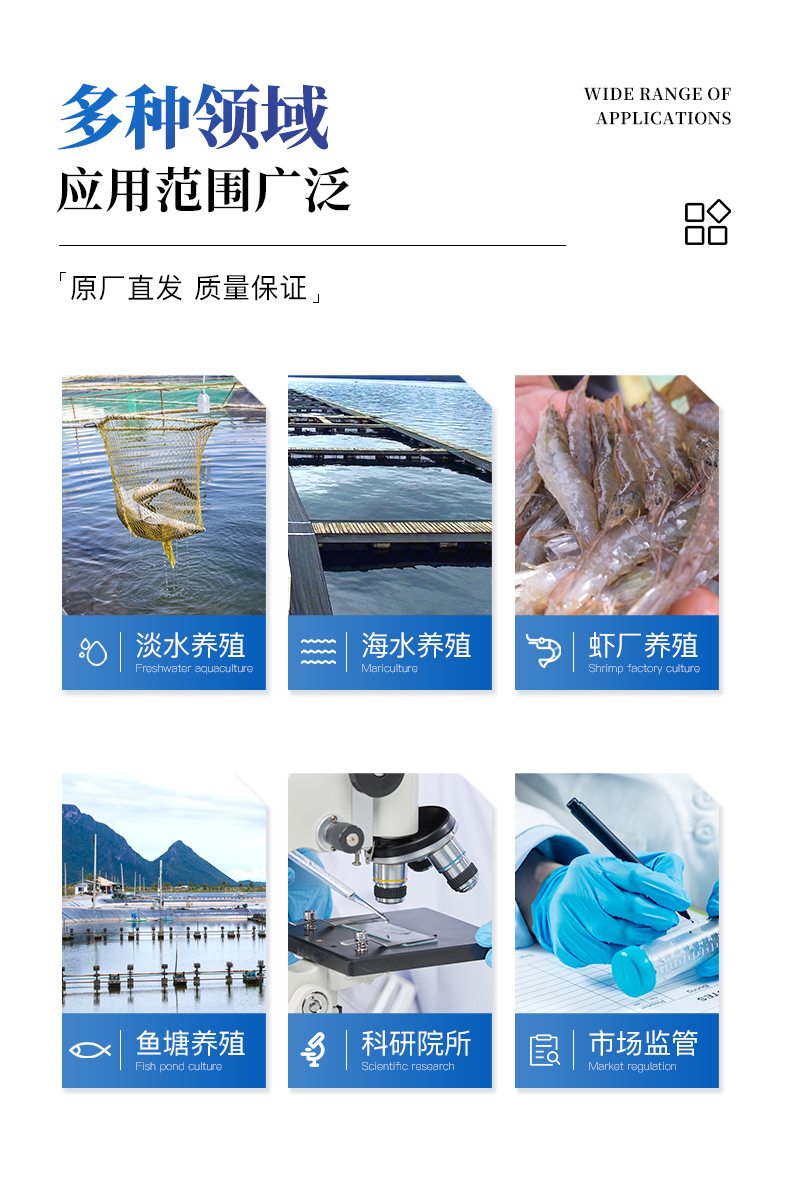 適用于游泳場館、戶內(nèi)外游泳池、水上樂園、溫泉浴池、純凈水廠、自來水廠、生活污水處理廠、工業(yè)污水、水產(chǎn)養(yǎng)殖、河流監(jiān)測、水源保護、生產(chǎn)監(jiān)測、科研實驗等。