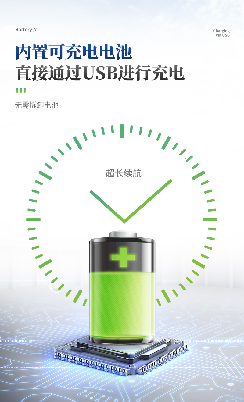 ? 內(nèi)置可充電電池,且直接通過USB進行充電,無需拆卸電池;