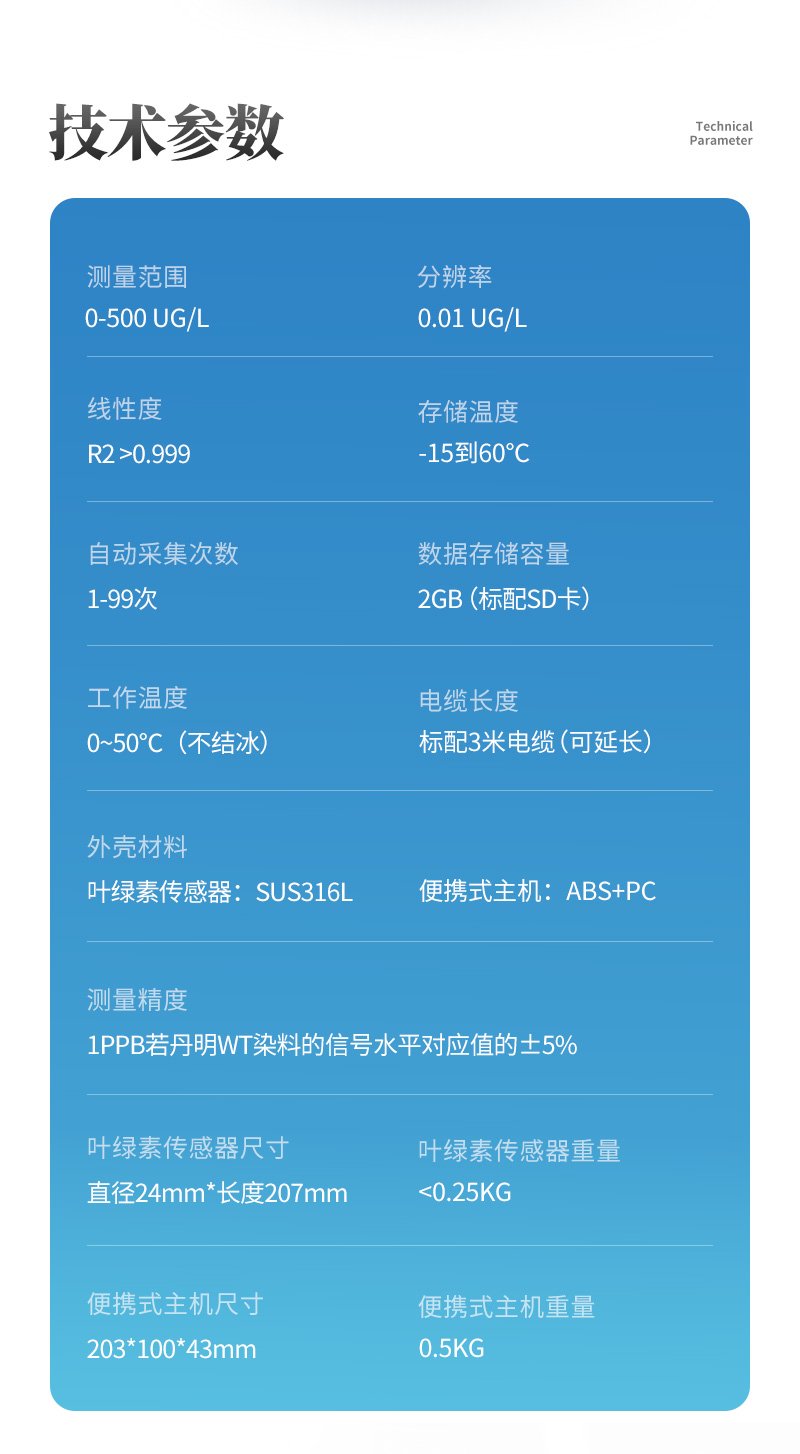 外殼材料 | 葉綠素傳感器:SUS316L 便攜式主機:ABS+PC |