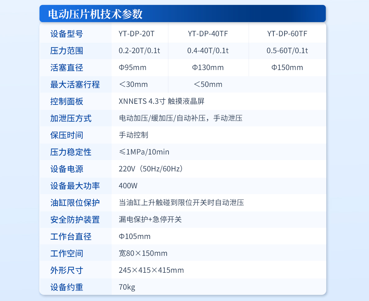 產(chǎn)品介紹: 產(chǎn)品概述:該機配置7寸觸摸液晶屏,程序控制實現(xiàn)了精準控壓,滿足了客戶多段加壓的需求,另外還增設(shè)了很多安全配置,適合**實驗室使用。技術(shù)參數(shù):設(shè)備型號:YT-ZP-20T壓力范圍:0.2-20T/0.1t油···2026-02-23