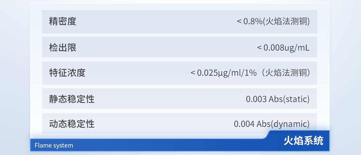 波長(zhǎng)范圍:185nm~900nm 自動(dòng)尋峰設(shè)置單色器類型:切爾尼-特納型(Czerny-Turner 型) 光譜帶寬:0.1/0.2/0.4/0.7/1.4 nm 五檔自動(dòng)切換 光柵閃耀波長(zhǎng):230nm 光柵刻線:1800 線/mm 波長(zhǎng)準(zhǔn)確度:≤±0.2nm 波長(zhǎng)重復(fù)性:< 0.10nm 分辨率:優(yōu)于 0.3nm 靜態(tài)基線穩(wěn)定性:0.003 Abs(static) 氘燈背景校正能力:60 倍以上 石墨爐控溫范圍:室溫--3000℃ 石墨爐升溫速率:3000℃/s 石墨爐測(cè)鎘(Cd)精密度:≤ 2% 石墨爐測(cè)鎘(Cd)特征量:≤ 0.5pg 石墨爐測(cè)鎘(Cd)檢出限:≤ 1pg 電源:220V±22V,50Hz±1Hz,5kW(峰值)