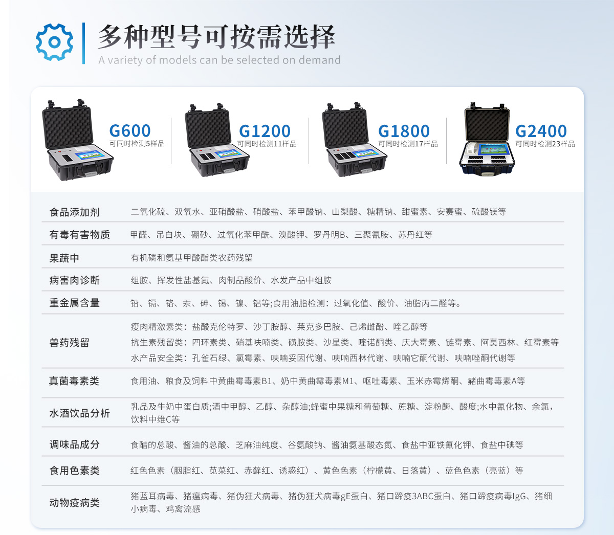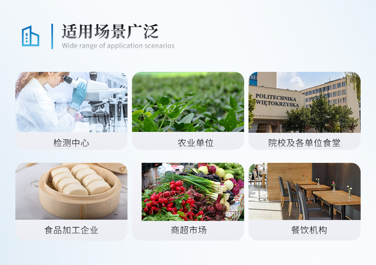 | 食品添加劑:二氧化硫、雙氧水、亞硝酸鹽、硝酸鹽、苯甲酸鈉、山梨酸、糖精鈉、甜蜜素、安賽蜜、硫酸鎂等 | 有毒有害物質(zhì):甲醛、吊白塊、硼砂、過氧化苯甲酰、溴酸鉀、羅丹明B、三聚氰胺、蘇丹紅等 | 果蔬中:有機磷和氨基甲酸酯類農(nóng)藥殘留; | 病害肉診斷:組胺、揮發(fā)性鹽基氮、肉制品酸價、水發(fā)產(chǎn)品中組胺 | 重金屬含量:鉛、鎘、鉻、汞、砷、錫、鎳、鋁等;食用油脂檢測:過氧化值、酸價、油脂丙二醛等。 | 瘦肉精激素類(獸藥):鹽酸克倫特羅、沙丁胺醇、萊克多巴胺、己烯雌酚、喹乙醇等 | 抗生素殘留類(獸藥):四環(huán)素類、硝基呋喃類、磺胺類、沙星類、喹諾酮類、慶大霉素、鏈霉素、阿莫西林、紅霉素等 | 水產(chǎn)品安全類:孔雀石綠、氯霉素、呋喃妥因代謝、呋喃西林代謝、呋喃它酮代謝、呋喃唑酮代謝等 | 真菌毒素類:食用油、糧食及飼料中黃曲霉毒素B1、奶中黃曲霉毒素M1、嘔吐毒素、玉米赤霉烯酮、赭曲霉毒素A等 | 水酒飲品分析:乳品及牛奶中蛋白質(zhì);酒中甲醇、乙醇、雜醇油;蜂蜜中果糖和葡萄糖、蔗糖、淀粉酶、酸度;水中氰化物、余氯,飲料中維C等 | 調(diào)味品成分:食醋的總酸、醬油的總酸、芝麻油純度、谷氨酸鈉、醬油氨基酸態(tài)氮、食鹽中亞鐵氰化鉀、食鹽中碘等 | 食用色素類:紅色色素(胭脂紅、莧菜紅、赤蘚紅、誘惑紅)、黃色色素(檸檬黃、日落黃)、藍色色素(亮藍)等 | 動物疫病類:豬藍耳病毒、豬瘟病毒、豬偽狂犬病毒、豬偽狂犬病毒gE蛋白、豬口蹄疫3ABC蛋白、豬口蹄疫病毒IgG、豬細小病毒、雞禽流感等 |