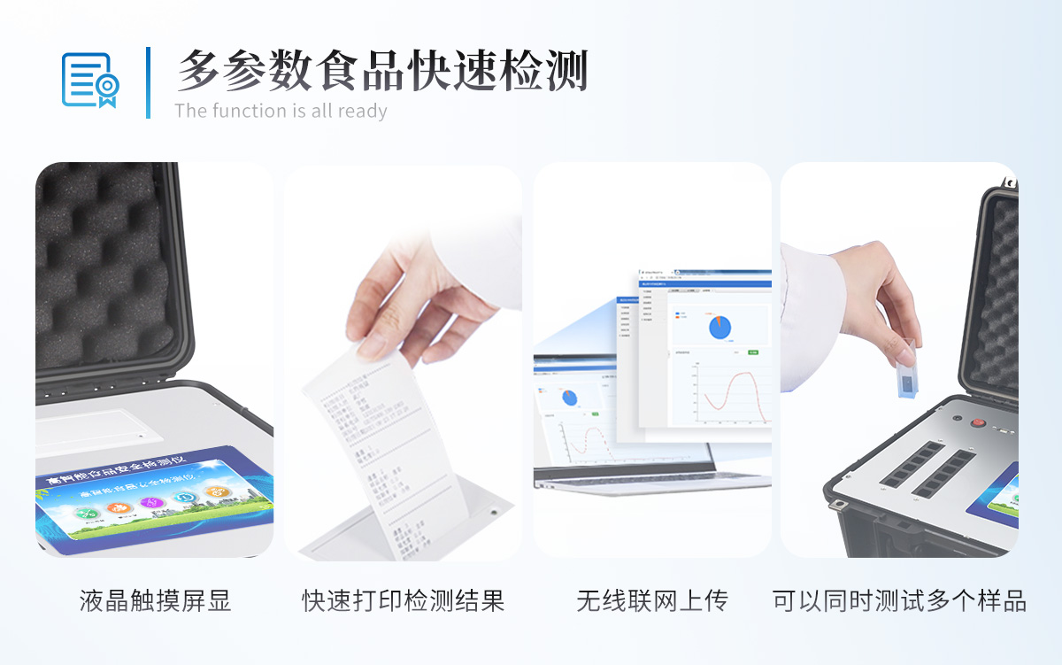 | 安卓智能操作系統(tǒng),采用更加**的UI交互界面,儀器具有wifi聯(lián)網(wǎng)上傳、4G聯(lián)網(wǎng)傳輸、GPRS無線遠傳、網(wǎng)線連接功能,快速批量上傳數(shù)據(jù)。 | 智能化程度高,儀器具有自檢功能:具有開機自檢和調(diào)零功能,具有自動檢測重復(fù)性功能。 | 新一代高速熱敏打印機,檢測完成可自動打印或批量打印檢測報告和二維碼。 | 儀器帶有監(jiān)管平臺,數(shù)據(jù)可局域網(wǎng)和互聯(lián)網(wǎng)數(shù)據(jù)上傳,檢測結(jié)果直接傳至食品安全監(jiān)管平臺。進行區(qū)域食品安全監(jiān)管及大數(shù)據(jù)分析處理與數(shù)據(jù)統(tǒng)計,檢測區(qū)域食品安全長短期動態(tài),達到食品安全問題預(yù)估、預(yù)警 | 一體化主機,包含食品安全檢測模塊、多通道農(nóng)藥殘留檢測模塊、膠體金免疫層析檢測模塊。 | 一體化便攜式快檢設(shè)備,滿足現(xiàn)場及流動檢測使用需求,能夠在同一軟件下實現(xiàn)所有檢測項目的檢測,并可通過同一窗口直觀顯示檢測結(jié)果。 | 膠體金模塊檢測方式:軌道式自動傳輸掃描,檢測完成后自動退出檢測卡。 | CT線自動識別,無需手動調(diào)整。 | 內(nèi)置強大的數(shù)據(jù)庫,具有多品類多種類樣品菜單功能,可靈活選擇檢測樣品,不同的檢測通道可同時檢測不同的樣品項目。也可在儀器上直接編輯錄入樣品名稱、檢測指標(biāo)、送檢單位等信息并保存進樣品數(shù)據(jù)庫。 | 產(chǎn)品內(nèi)置操作演示視頻,是您身邊的化驗指導(dǎo)專家。 | 樣品處理簡單省力,整體操作快速、安全、便捷。 | 儀器具有自身保護功能,可設(shè)置用戶名及密碼,防止非工作人員操作等。 | 高靈敏度,高檢測精度,高重復(fù)性精度,掃描式高精度光學(xué)傳感器。 | 結(jié)果判定線可修改,對照值標(biāo)定值可保存,斷電不丟失數(shù)據(jù)。 | 兼容市場上所有的膠體金卡,使用耗材不受限制,極大增強用戶使用體驗。 | 儀器具有重新校準、鎖定、恢復(fù)出廠設(shè)置功能。 |
