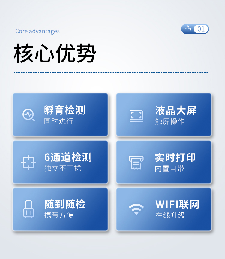 | 一體化設計,集成孵育和檢測功能同時進行,孵育完成直接檢測; | 全中文 7英寸高清液晶顯示,觸摸屏操作; | Android 系統(tǒng),支持在線升級,可WIFI聯(lián)網(wǎng); | 檢測原理:熒光定量免疫層析法; | 6通道設計,可同時進行一種或多種指標的檢測,6個獨立檢測單元,檢測效率高,并且互不干擾; | 具有二維碼自動識別系統(tǒng),可直接識別檢測項目、檢測流程等信息; | 儀器自帶熱敏打印機,檢測結果可實時打?。?/td> | 具有檢測數(shù)據(jù)存儲(存儲數(shù)量不少于 10000 條)、查詢、批量數(shù)據(jù)處理和打印功能; | 儀器≥2 個USB 接口,可拷貝結果及原始數(shù)據(jù),具有 wifi 接入模塊,可通過無線連接網(wǎng) 絡實現(xiàn)數(shù)據(jù)上傳; | 分鐘內(nèi)達到工作狀態(tài)(37℃),封閉系統(tǒng),不受外界環(huán)境(光、熱)干擾,工作環(huán)境溫度:0-30℃; | 真菌毒素和重金屬可同時進行前處理,并同時上機檢測; | 儀器配備全套前處理設備,拉桿箱設計,即可用于實驗室檢測可以外出攜帶檢測 | 相對極差≤10%; | 重復性 CV≤1%; | 批間變異≤3%; | 尺寸310x210x93mm |