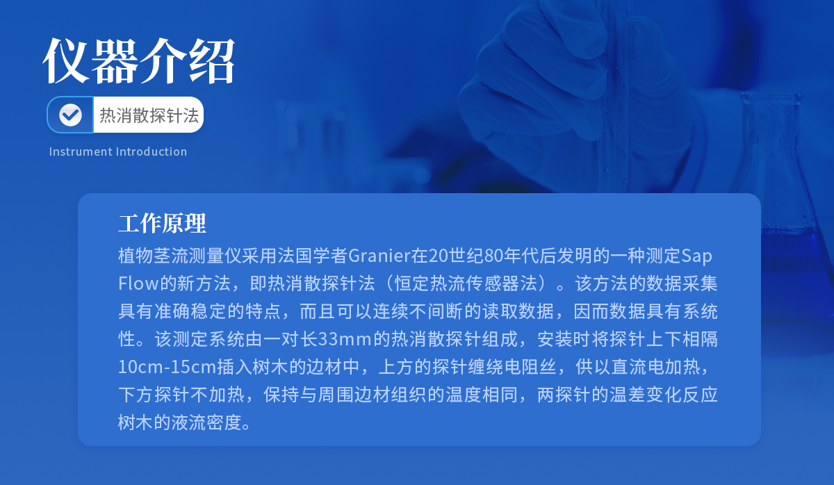 植物莖流測量儀采用法國學(xué)者Granier在20世紀(jì)80年代后發(fā)明的一種測定Sap Flow的新方法,即熱消散探針法(恒定熱流傳感器法)。該方法的數(shù)據(jù)采集具有準(zhǔn)確穩(wěn)定的特點,而且可以連續(xù)不間斷的讀取數(shù)據(jù),因而數(shù)據(jù)具有系統(tǒng)性。該測定系統(tǒng)由一對長33mm的熱消散探針組成,安裝時將探針上下相隔10cm-15cm插入樹木的邊材中,上方的探針纏繞電阻絲,供以直流電加熱,下方探針不加熱,保持與周圍邊材組織的溫度相同,兩探針的溫差變化反應(yīng)樹木的液流密度。