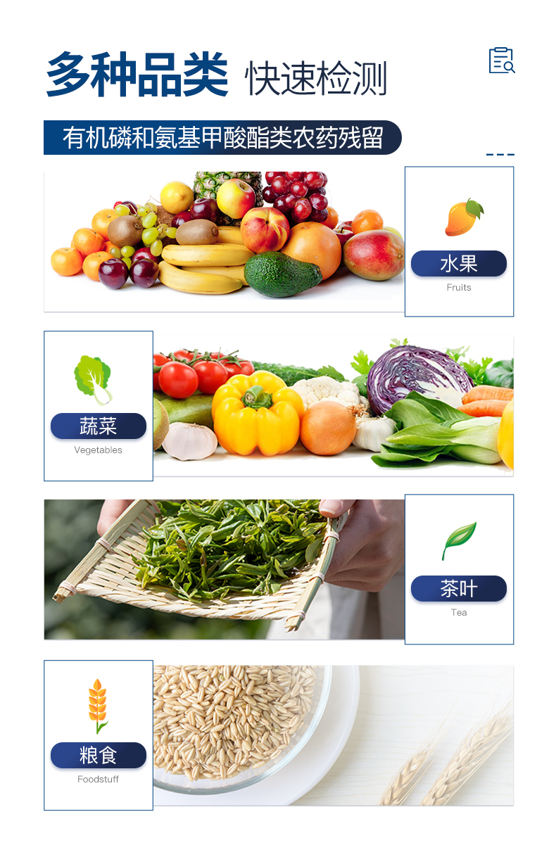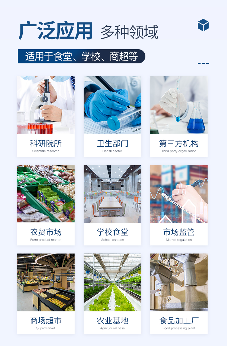 廣泛應(yīng)用于主要用于蔬菜、水果、茶葉、糧食、農(nóng)副產(chǎn)品等食品中有機(jī)磷和氨基甲酸酯類農(nóng)藥殘留的快速檢測(cè);此外還可用于果蔬茶生產(chǎn)基地和農(nóng)貿(mào)批發(fā)銷售市場(chǎng)現(xiàn)場(chǎng)檢測(cè),餐館、學(xué)校、食堂、家庭果蔬加工前的安全速測(cè)等。